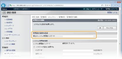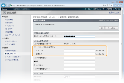 リモートUIから本機の設定を変更する場合には管理者権限が必要です。ここでは管理者権限でログインする場合のパスワード(管理者パスワード)を変更します。管理者パスワードは本機のセキュリティー上、特に重要です。管理者だけが管理者パスワードを知っているような体制にしてください。