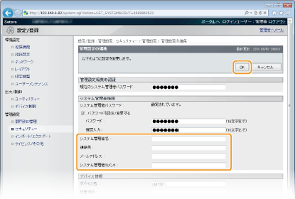 必要に応じて管理者の名前や連絡先を入力し、[OK]をクリックする