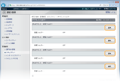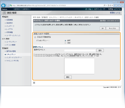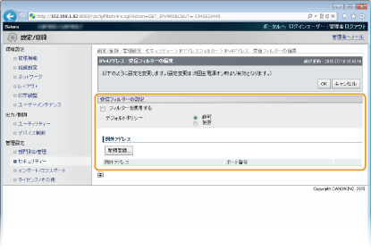 IPアドレスを間違えて設定すると、リモートUIからアクセスできなくなることがあります。この場合は、操作パネルから<アドレスフィルター>を<OFF>にしてください。アドレスフィルター