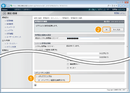 チェックマークを外すとUSBメモリーから直接印刷できなくなります。USBメモリーからの印刷を許可するときはチェックマークを付けます。[メディアプリント画面を自動表示する]にもチェックマークを付けると、USBメモリーを本機に取り付けたときにメディアプリントの画面が自動的に表示されるようになります。