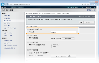 IEEE 802.1X認証のログイン名とは違うユーザー名を設定するときは、[ユーザー名にログイン名を使用する]のチェックマークを外します。IEEE 802.1X認証のログイン名と同じユーザー名にするときは、チェックマークを付けた状態にしてください。