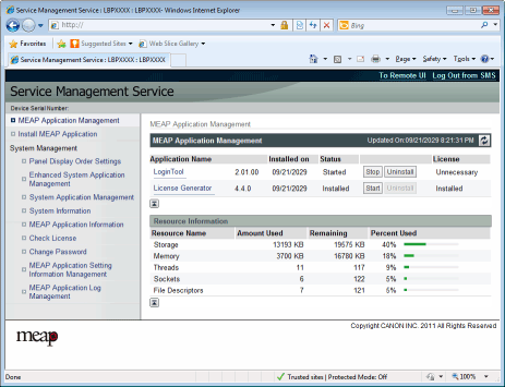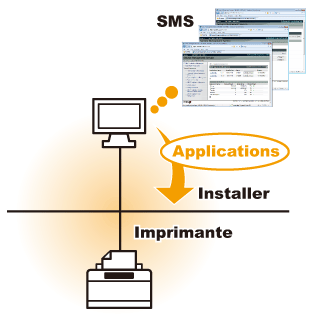 SMS (Service Management Service) est un logiciel qui accède à l'imprimante à partir du réseau depuis un navigateur Web existant, et qui peut installer et gérer des applications MEAP (appelées "applications" dans ce document). Comme le logiciel (serveur Web) permettant d'utiliser SMS est intégré à l'imprimante, aucun autre logiciel n'est nécessaire à l'exception du navigateur Web.