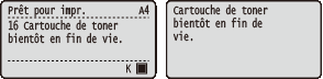 Lorsque le message <Cartouche de toner bientôt en fin de vie.> s'affiche, l'impression est temporairement arrêtée. Pour reprendre l'impression, appuyez sur