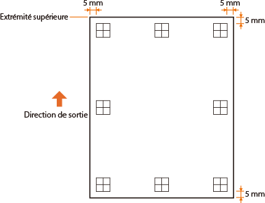 sont imprimés. Utilisez ces repères pour déterminer la direction et la distance pour ajuster la position d'impression. Lorsque la position d'impression est normale, tous les repères sont imprimés à 5 mm du bord le plus proche de la feuille de papier.
