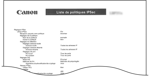 Vous examinez les noms de politiques et les réglages IPSec qui ont été enregistrés dans l'appareil en imprimant la liste des politiques IPSec.