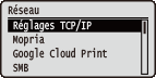Si <Réseau> n'est pas affichéSi <Réseau> sous <Sélection interface> est réglé sur <Non>, <Réseau> n'est pas affiché dans le menu Configuration. Sélection interface