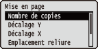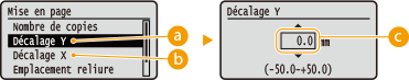 Vous pouvez sélectionner <Ajus. position impr.> sous <Maintenance utilis.> pour affiner la position d'impression pour chaque alimentation papier. La plage de valeurs de décalage disponible va de -5,0 à +5,0 mm. Réglage de la position d'impression