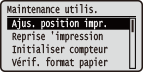 Les réglages de l'appareil, notamment ceux concernant la correction de la position d'impression pour chaque alimentation papier et l'amélioration de la qualité d'impression, sont répertoriés et accompagnés d'une brève description. Vous pouvez spécifier ces réglages lorsque l'appareil est hors ligne. Les réglages par défaut sont signalés par une croix (