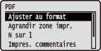 Tous les réglages concernant les fichiers PDF compatibles avec l'impression directe USB et l'impression directe sont répertoriés et accompagnés d'une brève description. Les réglages par défaut sont signalés par une croix (