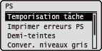Tous les réglages relatifs aux commandes de contrôle PS sont répertoriés et accompagnés d'une brève description. Les réglages par défaut sont signalés par une croix (