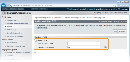 Test des communications avec le serveur NTP/SNTPVous pouvez afficher l'état des communications avec le serveur enregistrer en cliquant sur [Réglages/Enregistrement]
