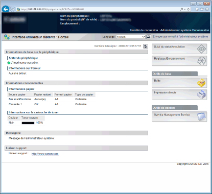 Vous pouvez effectuer toutes les opérations et tous les réglages de l'interface utilisateur distante. Saisissez le mot de passe d'administrateur système dans [Mot de passe].