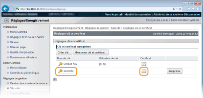 Il est impossible de supprimer une paire de clés en cours d'utilisation, comme lorsque "TLS" ou "IEEE 802.1X" s'affiche sous [Utilisation de clé]. Dans ce cas, désactivez la fonction ou remplacez la paire de clés avant de supprimer la paire de clés.