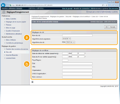 Il est possible de générer une paire de clés sur l'appareil lorsqu'elle est nécessaire à une communication cryptée en TLS (Transport Layer Security). Vous pouvez utiliser le cryptage TLS lorsque vous accédez à l'appareil au moyen de l'interface utilisateur distante ou pour utiliser l'impression IPP. Vous pouvez enregistrer jusqu'à huit paires de clés sur l'appareil, en comptant les paires pré-installées. Les certificats auto-signés sont utilisés avec les paires de clés générées dans "Communication réseau". Avec une "Clé et demande de signature de certificat (CSR)", vous pouvez demander un certificat numérique émis par une autorité de certification pour la paire de clés générées par l'appareil.