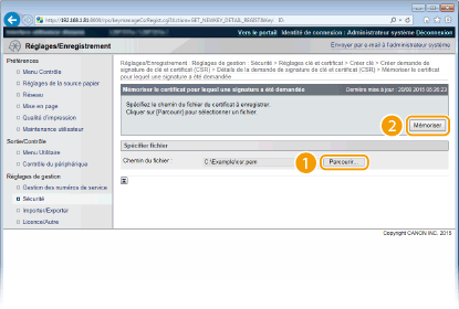 Cliquez sur [Parcourir] dans [Chemin du fichier], spécifiez le fichier associé à la demande de signature de certificat et cliquez sur [Mémoriser].