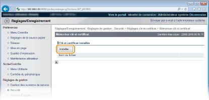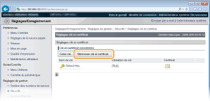 Cliquez sur [Réglages clé et certificat] pour installer une paire de clés, ou sur [Réglages de certificat CA] pour installer un certificat CA.