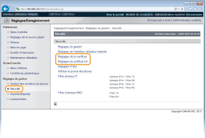 Cliquez sur [Sécurité]  [Réglages clé et certificat] ou [Réglages de certificat CA].