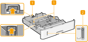 Regolare le guide della carta alle dimensioni esatte della carta caricata per assicurare la corretta alimentazione dei fogli nella macchina. Premere le leve di blocco contrassegnate con le frecce nelle illustrazioni per rilasciare i blocchi e far scorrere le guide della carta.