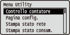 È possibile visualizzare il numero totale di pagine stampate e stampare informazioni di sistema interne. Quando si preme  (  ) sul pannello operativo, viene visualizzato il menu Utility. È possibile specificare le impostazioni descritte qui sotto quando la macchina è offline.