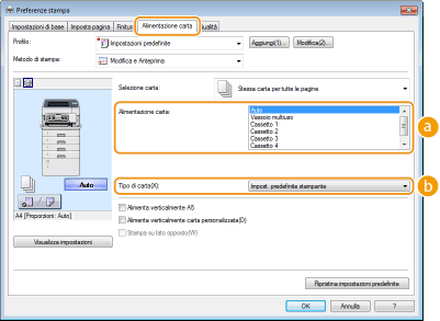 L'alimentazione carta viene selezionata automaticamente in base al tipo e al formato carta specificati per la stampa e alle impostazioni configurate nella macchina.