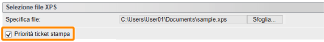 Quando si specificano le impostazioni di stampa per i file XPSDeselezionare la casella di controllo [Priorità ticket stampa]. Se essa è selezionata, alcune voci non sono disponibili.