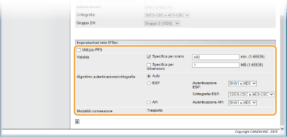 Prima di configurare le impostazioni della comunicazione IPSecVerificare le impostazioni IPSec del sistema operativo con cui la macchina comunicherà. Una combinazione errata di impostazioni del sistema operativo e impostazioni della macchina renderà impossibile la comunicazione IPSec.