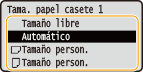 Si cambia con frecuencia el tamaño del papel a cargar, puede especificar <Tamaño libre> para no tener que preocuparse de cambiar el ajuste de tamaño de papel cada vez que imprime. Sin embargo, tenga en cuenta que en este caso el tamaño de papel especificado en el controlador de impresora no se verifica antes de imprimir.
