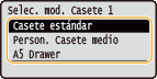 Si utiliza el casete A5 opcional o un casete de soporte personalizado, tiene que especificar <Selec. mod. Casete 1>. Así mismo, tiene que volver a cambiar la configuración a <Casete estándar> al sustituir el casete de papel opcional por el casete de papel estándar.