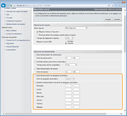Puede configurar el equipo para que se apague automáticamente si no se utiliza durante un periodo prolongado. También puede configurar el equipo para que se apague a una hora determinada. Estas funciones le permiten evitar el consumo energético innecesario derivado de no apagar la alimentación. De forma predeterminada de fábrica, esta función está habilitada.