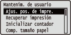 Las opciones de ajuste del equipo, incluida la corrección de la posición de impresión de cada origen de papel y la mejora de la calidad de impresión, se enumeran con descripciones breves. Puede especificar dichas opciones cuando el equipo no esté en línea. Las opciones predeterminadas están marcadas con una cruz (