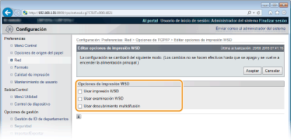 Seleccione la casilla de verificación para obtener información sobre el equipo desde un ordenador a través de WSD. Esta casilla de verificación se selecciona automáticamente cuando se marca la casilla de verificación [Usar impresión WSD].