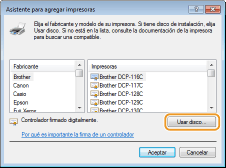 Especifique la carpeta que contiene los controladores de impresora, seleccione el archivo INF y haga clic en [Abrir].