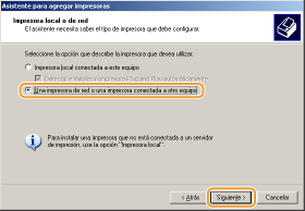 Seleccione [Una impresora de red o una impresora conectada a otro equipo] y haga clic en [Siguiente].
