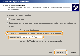 Seleccione [Conectarse a una impresora en Internet o en su red doméstica u organización:], introduzca el destino de conexión y haga clic en [Siguiente].