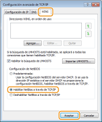 Haga clic en la pestaña [WINS], seleccione [Habilitar NetBios a través de TCP/IP] y luego haga clic en [Aceptar].