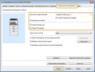 Puede usar los controladores de impresora PCL6 así como el controlador de impresora UFR II. Las opciones de impresión disponibles varían en función del controlador de impresora. Para obtener más información, haga clic en [Ayuda] en la pantalla de cada controlador de impresora.