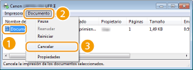 Cancelación desde la IU remotaPuede cancelar la impresión desde la página [Estado de trabajos] de la IU remota: Comprobación del estado actual de los documentos de impresión