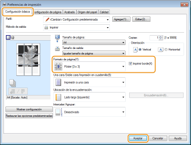 Pestaña [Configuración básica]  En [Formato de página], seleccione las dimensiones del póster (por ejemplo, [Póster [2 x 2]]) [Aceptar]
