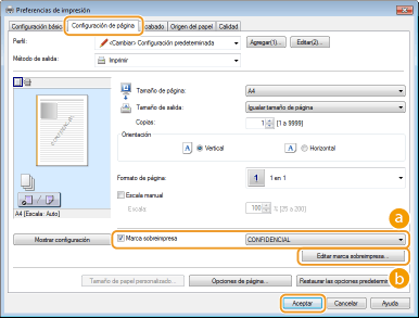 Puede imprimir marcas sobreimpresas tales como "COPIA" o "CONFIDENCIAL" en el documento. Puede crear nuevas marcas sobreimpresas o utilizar marcas sobreimpresas registradas previamente.