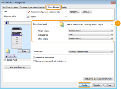 Seleccione las páginas que desee imprimir en un papel diferente y el origen del papel cargado con el papel en [Selección del papel]