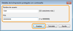 Introduzca el [Nombre del documento], [Nombre de usuario] y [PIN], y haga clic en [Aceptar].