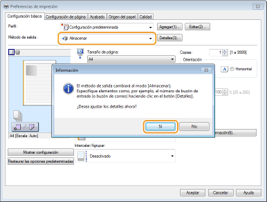 Seleccione [Almacenar] en [Método de salida] y haga clic en [Sí].