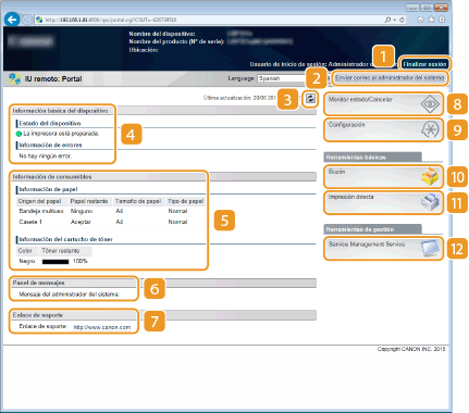 Muestra un mensaje del Administrador de sistema especificado en [Panel de mensajes/Enlace de soporte] dentro de [Configuración]