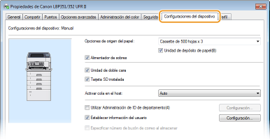 Haga clic en la pestaña [Configuraciones del dispositivo] y especifique las opciones necesarias.