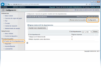 Seleccione la casilla de verificación [Utilizar Administración de ID de departamento] y haga clic en [Configuración], situado a su derecha.