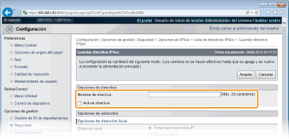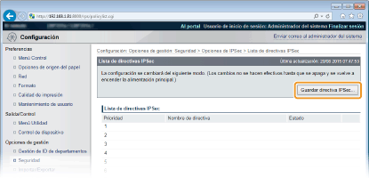 Antes de configurar las opciones de comunicación IPSecCompruebe las opciones de IPSec en el sistema operativo con que se va a comunicar el equipo. Una combinación incorrecta de opciones del sistema operativo y el equipo deshabilitará la comunicación IPSec.