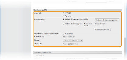 Seleccione [Método de clave precompartida] para [Método de AUT.] y hago clic en [Opciones de clave compartida].