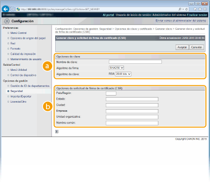 Los pares de claves pueden generarse con el equipo en caso necesario para la comunicación cifrada a través de la Seguridad de capa de transporte (Transport Layer Security, TLS). Podrá utilizar TLS para acceder al equipo a través de la IU remota o realizar la Impresión IPP. Podrán registrarse hasta ocho pares de claves, incluidas las que están preinstaladas. Los certificados autofirmados se utilizan con pares de claves generados en la "Comunicación de red". Con una "Clave y solicitud de firma de certificado (CSR)", podrá solicitar un certificado digital emitido por la autoridad de certificación (CA) para el par de claves generado por el equipo.