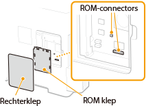 Dit gedeelte beschrijft hoe u de Barcode Printing Kit-F1 of PCL International Font Set-C1 in het apparaat plaatst. Het ROM wordt aangesloten op de ROM connectors in de rechter klep van het apparaat. Lees de waarschuwingen in Installatie voordat u het ROM installeert.