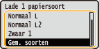Maak een keuze uit <Lade 1 papiersoort> tot <Lade 5 papiersoort> en druk op